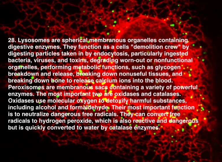 28. Lysosomes are spherical membranous organelles containing digestive enzymes. They function as a cells "demolition crew" by digesting particles taken in by endocytosis, particularly ingested bacteria, viruses, and toxins, degrading worn-out or nonfunctional organelles, performing metabolic functions, such as glycogen breakdown and release, breaking down nonuseful tissues, and breaking down bone to release calcium ions into the blood. Peroxisomes are membranous sacs containing a variety of powerful enzymes. The most important two are oxidases and catalases. Oxidases use molecular oxygen to detoxify harmful substances, including alcohol and formaldehyde. Their most important function is to neutralize dangerous free radicals. They can convert free radicals to hydrogen peroxide, which is also reactive and dangerous but is quickly converted to water by catalase enzymes.