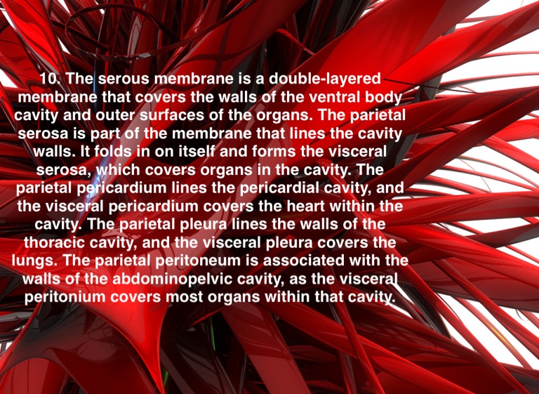 10. The serous membrane is a double-layered membrane that covers the walls of the ventral body cavity and outer surfaces of the organs. The parietal serosa is part of the membrane that lines the cavity walls. It folds in on itself and forms the visceral serosa, which covers organs in the cavity. The parietal pericardium lines the pericardial cavity, and the visceral pericardium covers the heart within the cavity. The parietal pleura lines the walls of the thoracic cavity, and the visceral pleura covers the lungs. The parietal peritoneum is associated with the walls of the abdominopelvic cavity, as the visceral peritonium covers most organs within that cavity.