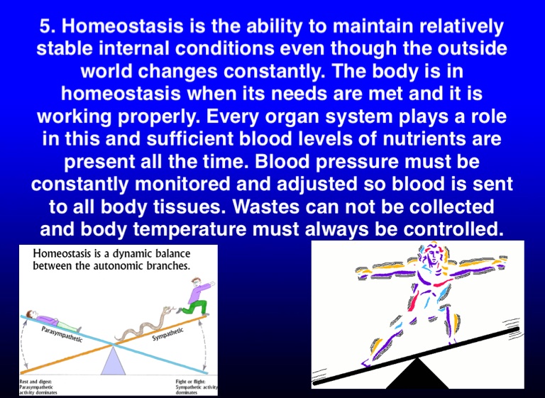 5. Homeostasis is the ability to maintain relatively stable internal conditions even though the outside world changes constantly. The body is in homeostasis when its needs are met and it is working properly. Every organ system plays a role in this and sufficient blood levels of nutrients are present all the time. Blood pressure must be constantly monitored and adjusted so blood is sent to all body tissues. Wastes can not be collected and body temperature must always be controlled.