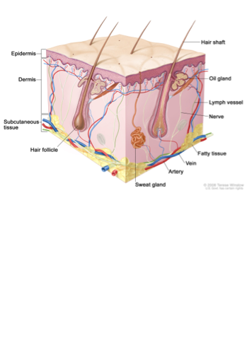 Skin is the largest, heaviest, and takes up the most space on our body compared to the other 8 major organs. As seen by the picture, we can see that skin has many parts, from hair follicles, to sweat glands. It has many veins and arteries, along with 2 main layers: The Dermis ( the inside, is mostly made up of everything the skin is protecting ), and The Epidermis ( the outside, it's made up of the seven layers of skin ). It is located on the outer layers of our bodies, and is always visible. It is very prone to diseases, as it is the most vulnerable part of our body, because it is the protection of our vital organs. It is also vulnerable to the ultra-violet rays of the sun, and if exposed to these rays for too long, it could cause skin cancer, and other skin related issues.