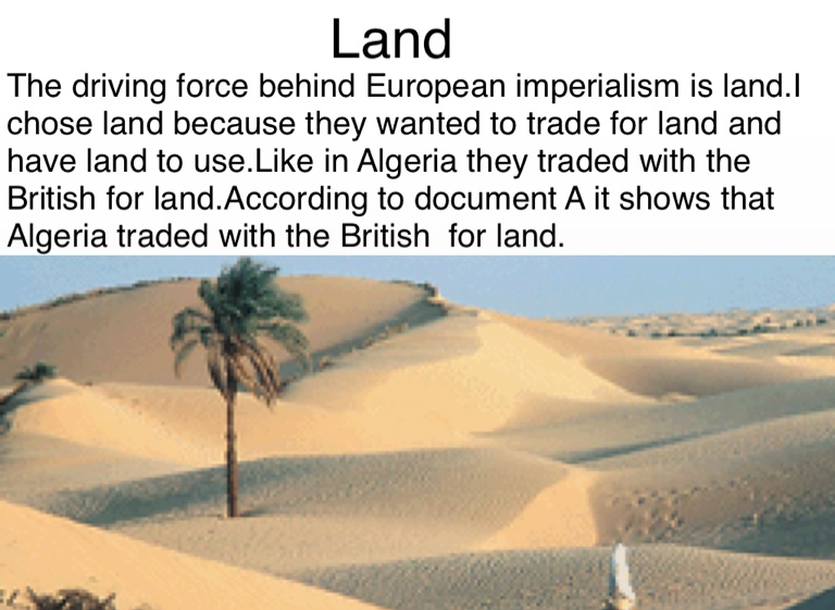 The driving force behind European imperialism is land.I chose land because they wanted to trade for land and have land to use.Like in Algeria they traded with the British for land.According to document A it shows that Algeria traded with the British for land.