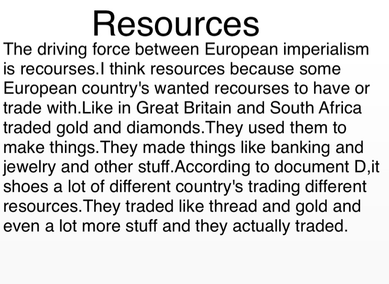 The driving force between European imperialism is recourses.I think resources because some European country's wanted recourses to have or trade with.Like in Great Britain and South Africa traded gold and diamonds.They used them to make things.They made things like banking and jewelry and other stuff.According to document D,it shoes a lot of different country's trading different resources.They traded like thread and gold and even a lot more stuff and they actually traded.