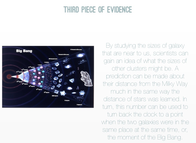 By studying the sizes of galaxy that are near to us, scientists can gain an idea of what the sizes of other clusters might be. A prediction can be made about their distance from the Milky Way much in the same way the distance of stars was learned. In turn, this number can be used to turn back the clock to a point when the two galaxies were in the same place at the same time, or, the moment of the Big Bang.