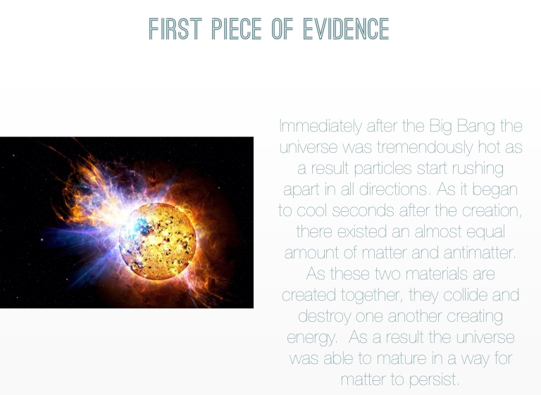 Immediately after the Big Bang the universe was tremendously hot as a result particles start rushing apart in all directions. As it began to cool seconds after the creation, there existed an almost equal amount of matter and antimatter. As these two materials are created together, they collide and destroy one another creating energy. As a result the universe was able to mature in a way for matter to persist.