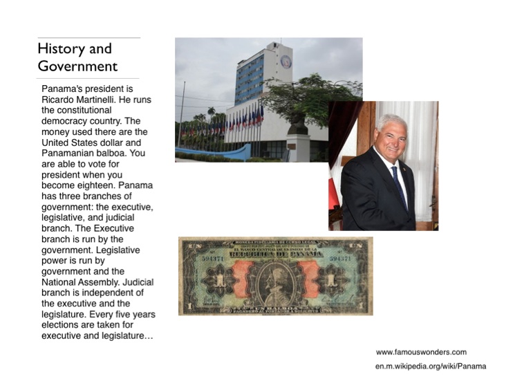 Panama's president is Ricardo Martinelli. He runs the constitutional democracy country. The money used there are the United States dollar and Panamanian balboa. You are able to vote for president when you become eighteen. Panama has three branches of government: the executive, legislative, and judicial branch. The Executive branch is run by the government. Legislative power is run by government and the National Assembly. Judicial branch is independent of the executive and the legislature. Every five years elections are taken for executive and legislature positions.
