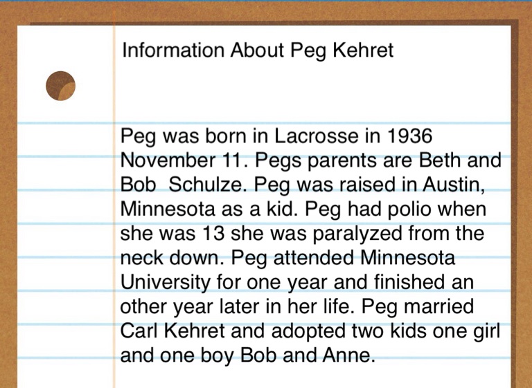 Peg was born in Lacrosse in 1936 November 11. Pegs parents are Beth and Bob Schulze. Peg was raised in Austin, Minnesota as a kid. Peg had polio when she was 13 she was paralyzed from the neck down. Peg attended Minnesota University for one year and finished an other year later in her life. Peg married Carl Kehret and adopted two kids one girl and one boy Bob and Anne.