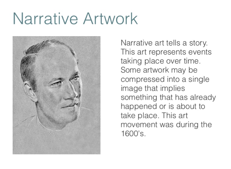 Narrative art tells a story. This art represents events taking place over time. Some artwork may be compressed into a single image that implies something that has already happened or is about to take place. This art movement was during the 1600's.