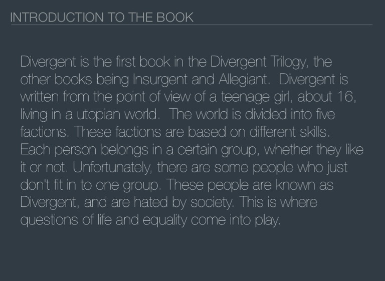 Divergent is the first book in the Divergent Trilogy, the other books being Insurgent and Allegiant. Divergent is written from the point of view of a teenage girl, about 16, living in a utopian world. The world is divided into five factions. These factions are based on different skills. Each person belongs in a certain group, whether they like it or not. Unfortunately, there are some people who just don't fit in to one group. These people are known as Divergent, and are hated by society. This is where questions of life and equality come into play.