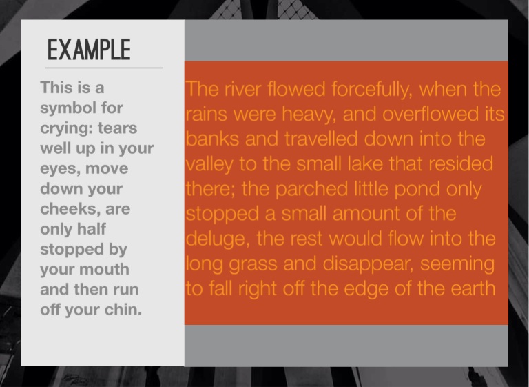 The river flowed forcefully, when the rains were heavy, and overflowed its banks and travelled down into the valley to the small lake that resided there; the parched little pond only stopped a small amount of the deluge, the rest would flow into the long grass and disappear, seeming to fall right off the edge of the earth