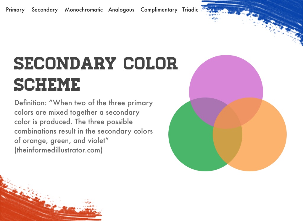 Definition: “When two of the three primary colors are mixed together a secondary color is produced. The three possible combinations result in the secondary colors of orange, green, and violet”