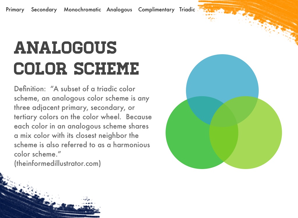 Definition: “A subset of a triadic color scheme, an analogous color scheme is any three adjacent primary, secondary, or tertiary colors on the color wheel. Because each color in an analogous scheme shares a mix color with its closest neighbor the scheme is also referred to as a harmonious color scheme.”