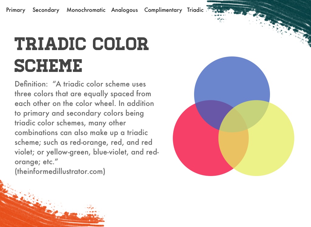 Definition: “A triadic color scheme uses three colors that are equally spaced from each other on the color wheel. In addition to primary and secondary colors being triadic color schemes, many other combinations can also make up a triadic scheme; such as red-orange, red, and red violet; or yellow-green, blue-violet, and red-orange; etc.”