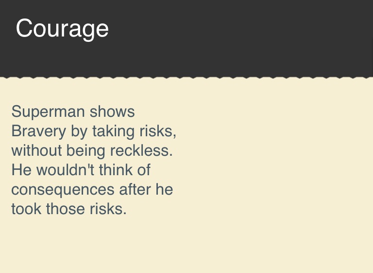 Superman shows Bravery by taking risks, without being reckless. He wouldn't think of consequences after he took those risks.