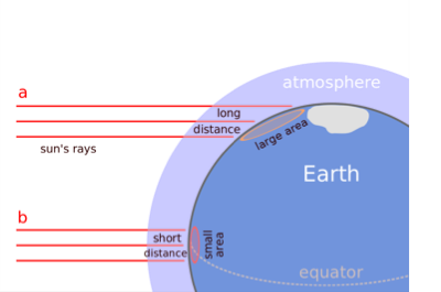 The angle of sunlight is what causes the amount of solar energy effects the heat, season, and hours of sunlight. The angle of sunlight varies depending on where you are because the Earth is a sphere and so the rays wrap around it, causing direct and indirect sunlight