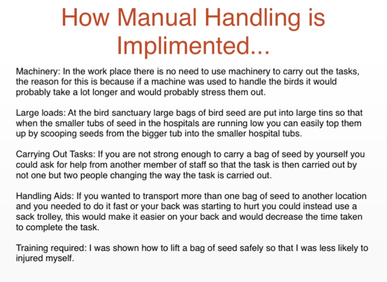 Machinery: In the work place there is no need to use machinery to carry out the tasks, the reason for this is because if a machine was used to handle the birds it would probably take a lot longer and would probably stress them out.