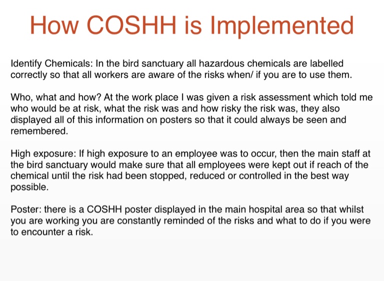 Identify Chemicals: In the bird sanctuary all hazardous chemicals are labelled correctly so that all workers are aware of the risks when/ if you are to use them.