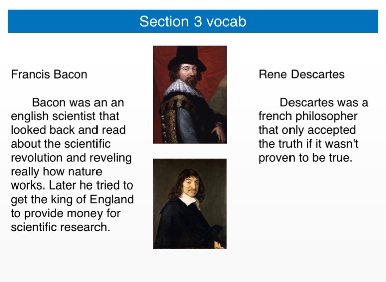 Bacon was an an english scientist that looked back and read about the scientific revolution and reveling really how nature works. Later he tried to get the king of England to provide money for scientific research.