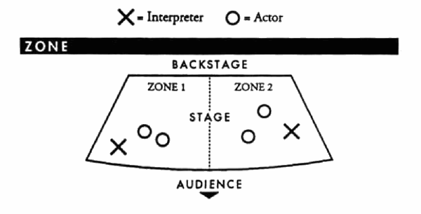 Zoned theatre involves the placement of interpreters onto the playing space, often at the outer edges. Interpreters sign the spoken dialogue that occurs on that side of the stage.