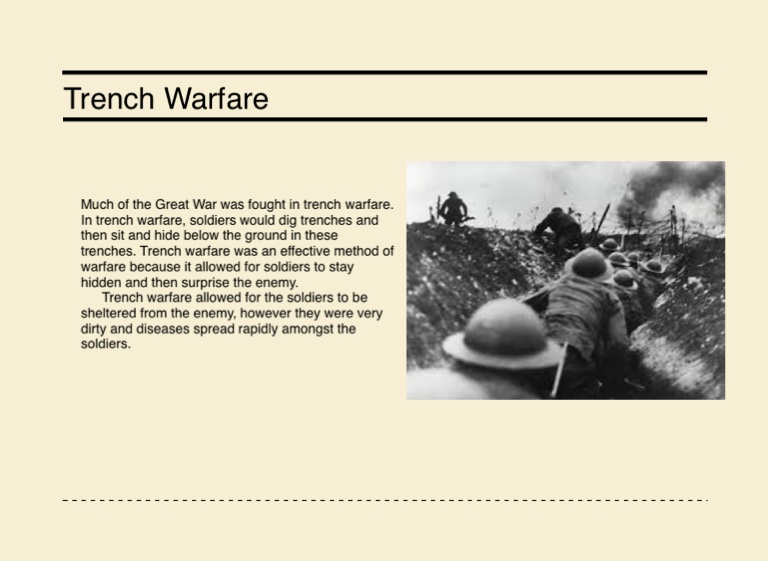Much of the Great War was fought in trench warfare. In trench warfare, soldiers would dig trenches and then sit and hide below the ground in these trenches. Trench warfare was an effective method of warfare because it allowed for soldiers to stay hidden and then surprise the enemy.