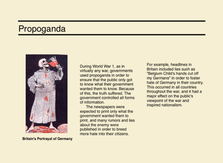 For example, headlines in Britain included lies such as "Belgium Child's hands cut off my Germans" in order to foster hate of Germany in their country. This occurred in all countries throughout the war, and it had a major effect on the public's viewpoint of the war and inspired nationalism.
