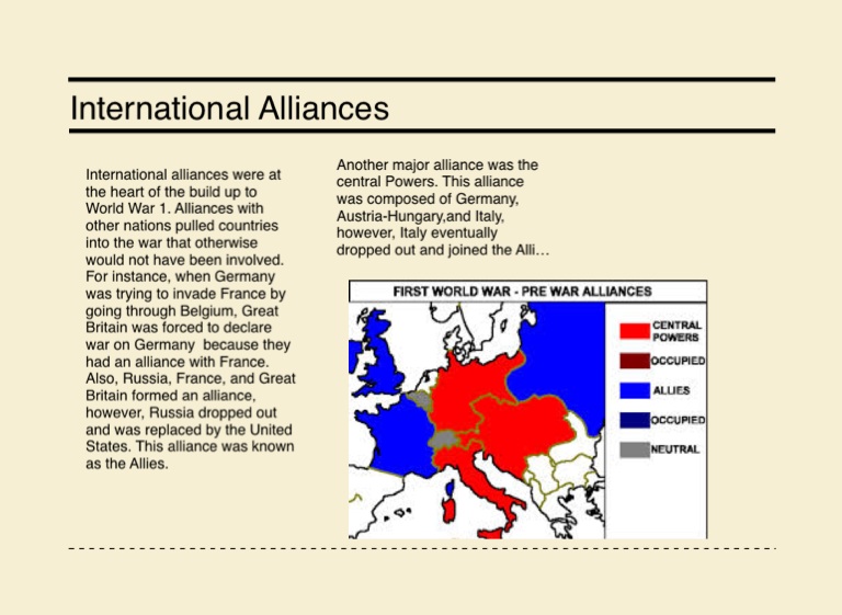 International alliances were at the heart of the build up to World War 1. Alliances with other nations pulled countries into the war that otherwise would not have been involved. For instance, when Germany was trying to invade France by going through Belgium, Great Britain was forced to declare war on Germany because they had an alliance with France. Also, Russia, France, and Great Britain formed an alliance, however, Russia dropped out and was replaced by the United States. This alliance was known as the Allies.