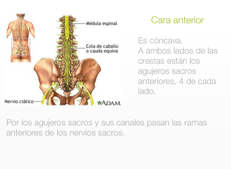 A ambos lados de las crestas están los agujeros sacros anteriores, 4 de cada lado.