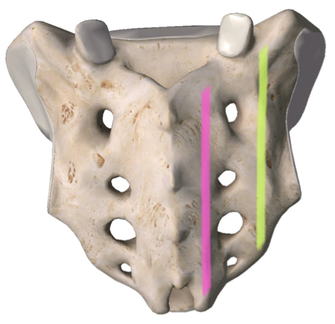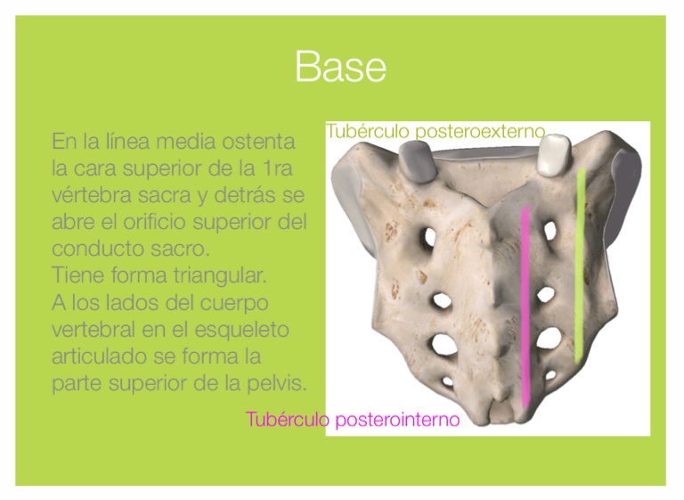 En la línea media ostenta la cara superior de la 1ra vértebra sacra y detrás se abre el orificio superior del conducto sacro.