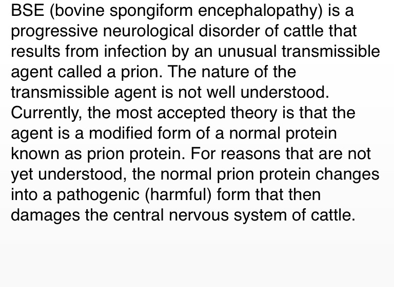 BSE (bovine spongiform encephalopathy) is a progressive neurological disorder of cattle that results from infection by an unusual transmissible agent called a prion. The nature of the transmissible agent is not well understood. Currently, the most accepted theory is that the agent is a modified form of a normal protein known as prion protein. For reasons that are not yet understood, the normal prion protein changes into a pathogenic (harmful) form that then damages the central nervous system of cattle.