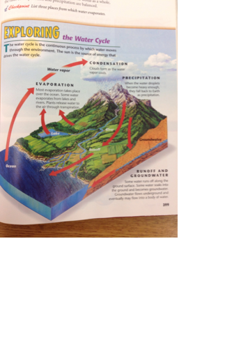 In the water cycle water moves from bodies of water,land,and living things on Earth's surface to the atmosphere and back to Earth's surface.