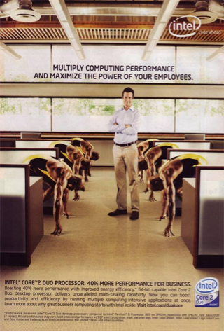 They are referencing this Ad back to slaery. The white male is the boss and the African Americans are the workers.