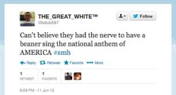 Many racial slurs were said on Twitter about how they should not have let Sebastian sing the national anthem how come he is latino. Some people say it is a disgrace to the national anthem.