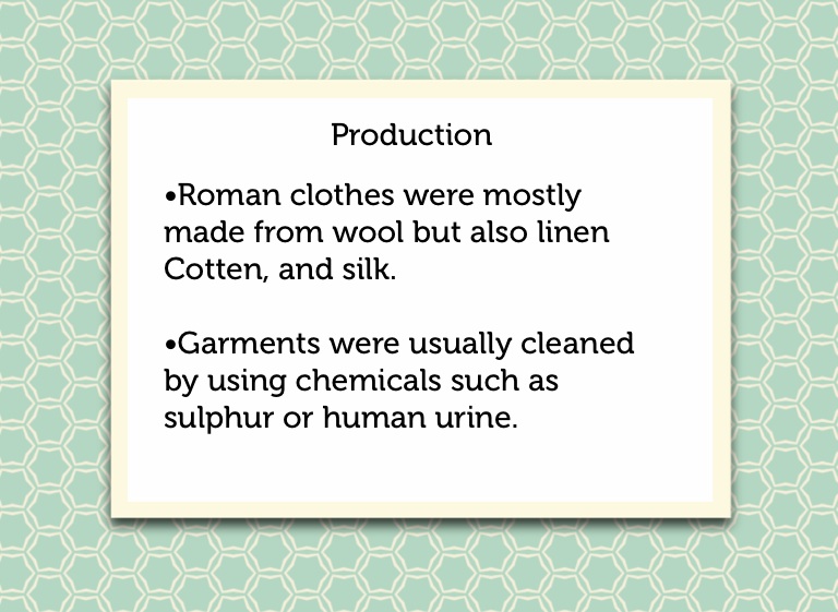 •Roman clothes were mostly made from wool but also linen Cotten, and silk.