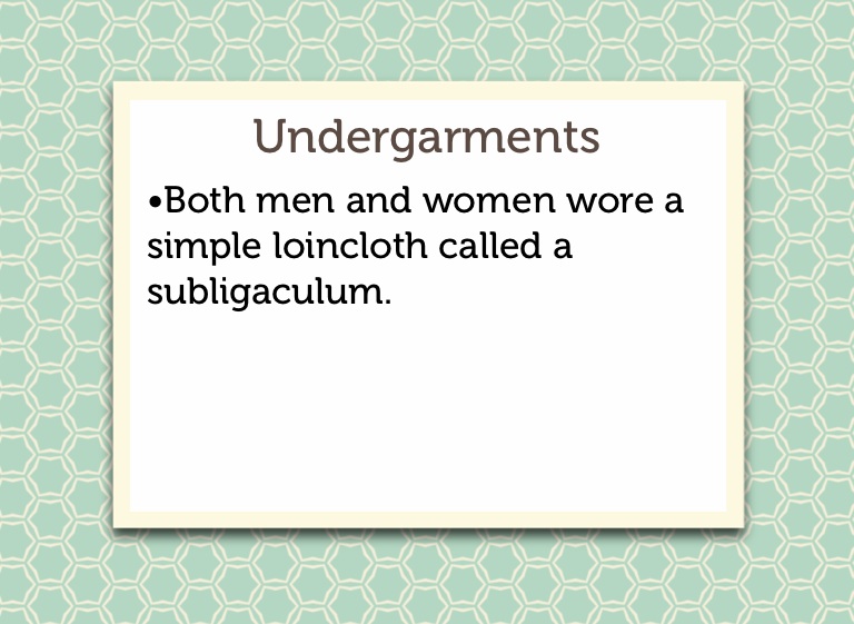 •Both men and women wore a simple loincloth called a subligaculum.