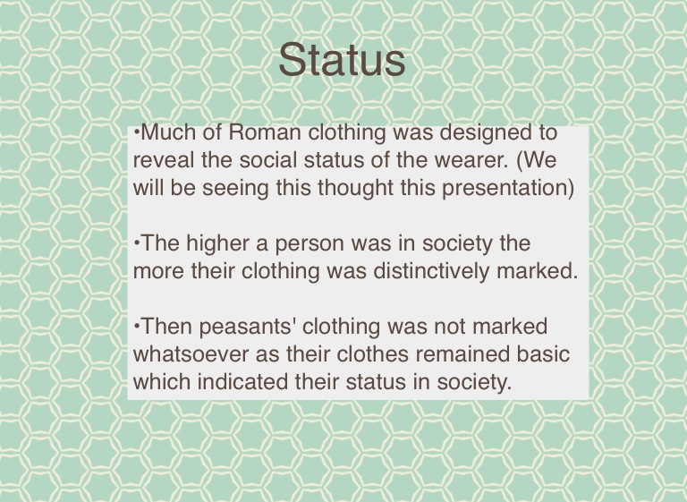 •Much of Roman clothing was designed to reveal the social status of the wearer. (We will be seeing this thought this presentation)