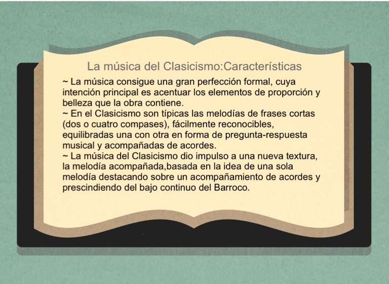 ~ La música del Clasicismo dio impulso a una nueva textura, la melodía acompañada,basada en la idea de una sola melodía destacando sobre un acompañamiento de acordes y prescindiendo del bajo continuo del Barroco.
