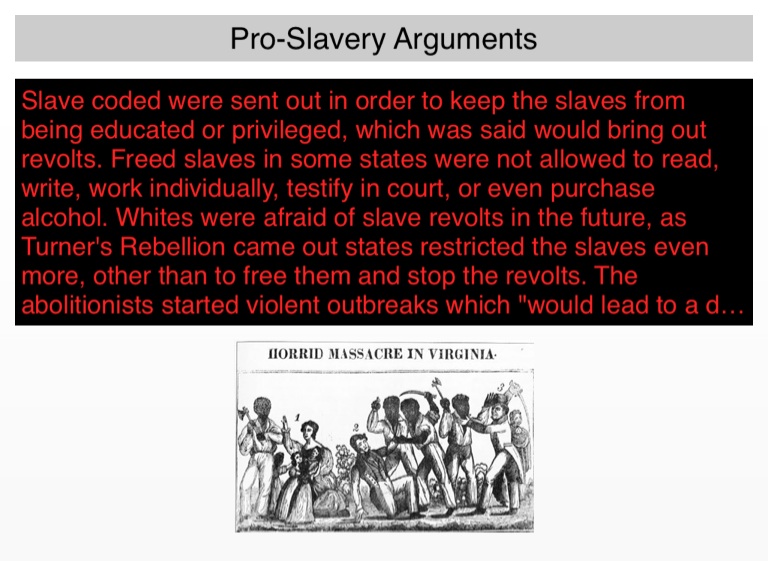 Slave coded were sent out in order to keep the slaves from being educated or privileged, which was said would bring out revolts. Freed slaves in some states were not allowed to read, write, work individually, testify in court, or even purchase alcohol. Whites were afraid of slave revolts in the future, as Turner's Rebellion came out states restricted the slaves even more, other than to free them and stop the revolts. The abolitionists started violent outbreaks which "would lead to a divided nation."