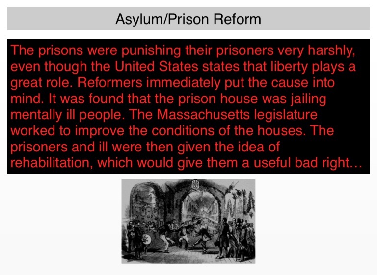 The prisons were punishing their prisoners very harshly, even though the United States states that liberty plays a great role. Reformers immediately put the cause into mind. It was found that the prison house was jailing mentally ill people. The Massachusetts legislature worked to improve the conditions of the houses. The prisoners and ill were then given the idea of rehabilitation, which would give them a useful bad rightful place in society.