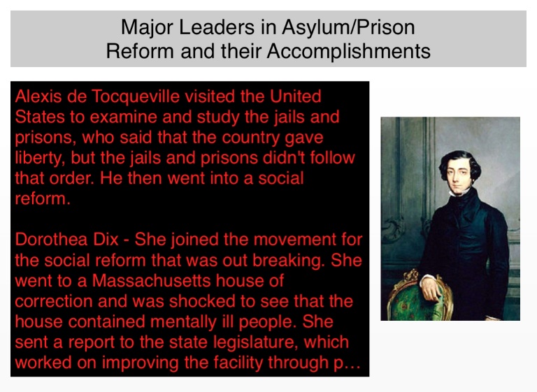 Alexis de Tocqueville visited the United States to examine and study the jails and prisons, who said that the country gave liberty, but the jails and prisons didn't follow that order. He then went into a social reform.