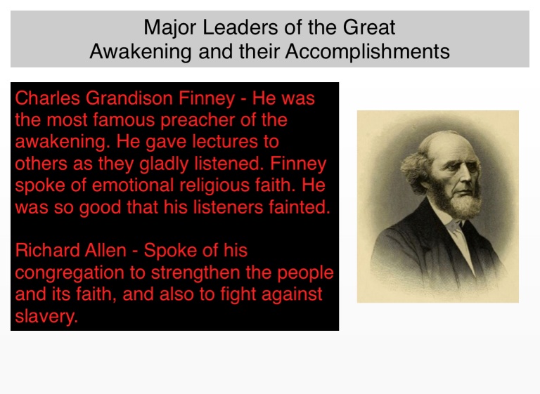 Charles Grandison Finney - He was the most famous preacher of the awakening. He gave lectures to others as they gladly listened. Finney spoke of emotional religious faith. He was so good that his listeners fainted.
