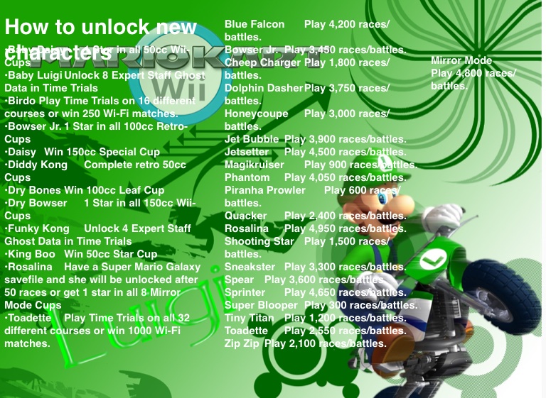 •Rosalina Have a Super Mario Galaxy savefile and she will be unlocked after 50 races or get 1 star in all 8 Mirror Mode Cups