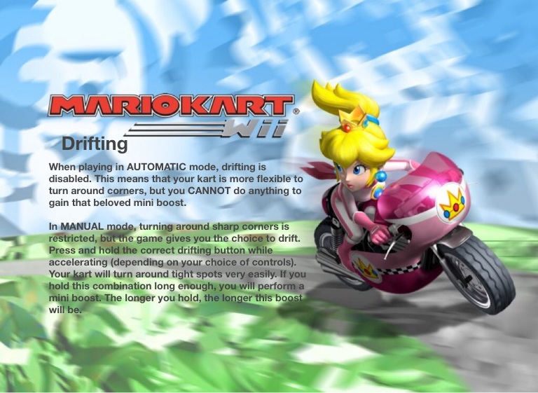 In MANUAL mode, turning around sharp corners is restricted, but the game gives you the choice to drift. Press and hold the correct drifting button while accelerating (depending on your choice of controls). Your kart will turn around tight spots very easily. If you hold this combination long enough, you will perform a mini boost. The longer you hold, the longer this boost will be.