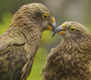 The colour of the feathers are mostly olive green and a little bit of orange under its wing and has a large grey-brown upper beak.There's not much difference in apparence between the male and female except that the male has a more curved beak.