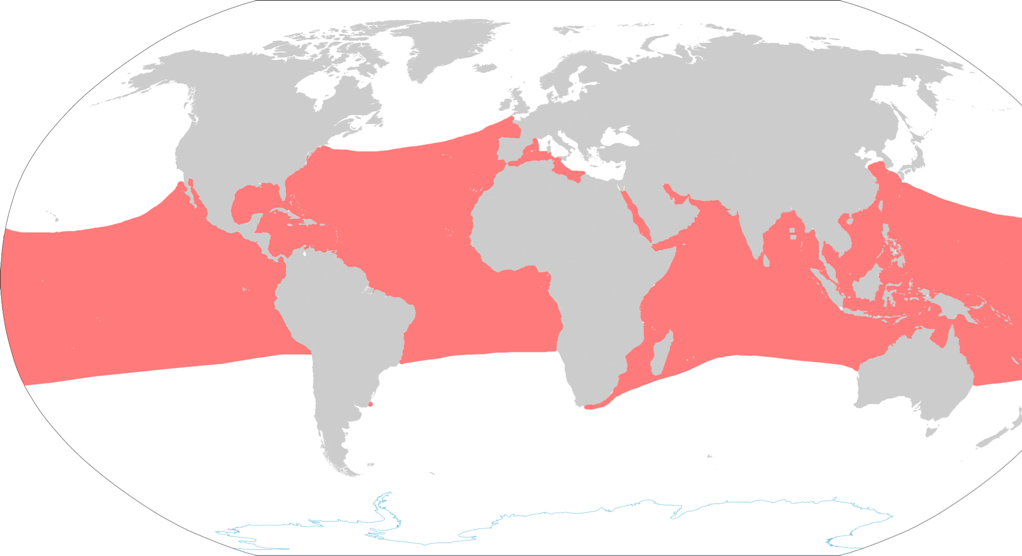 They live throughout the world’s tropical and subtropical oceans, ranging primarily from 30°N to 30°S, being found mainly in the tropical regions of the Atlantic, Indian and Western Pacific oceans.