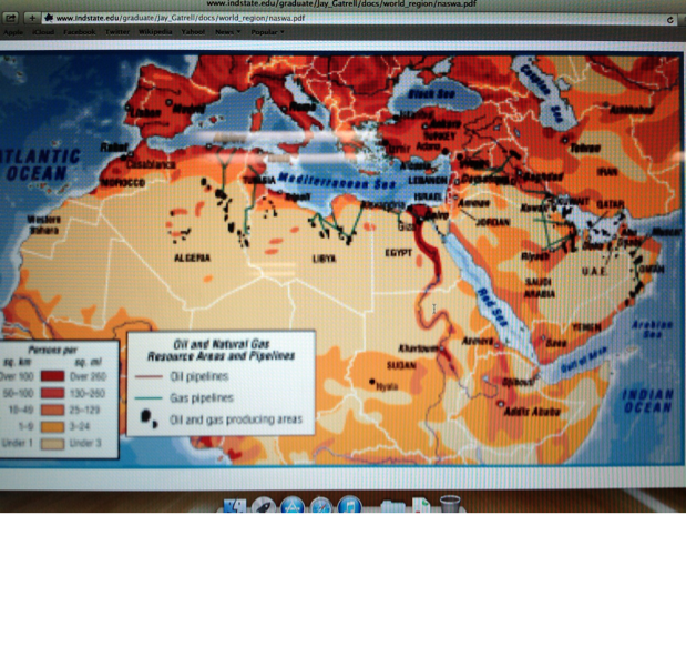 The map illustrates the oil and natural gas production in SWANA. Also you can see near Libya that there are gas pipelines connected to the Mediterranean Sea. The organization that started this oil boom was OPEC ( Organization of the Petroleum Exporting Countries). Although the amount of gas is almost unlimited and gas prices are low the water supply in this country is very limited because in the Mediterranean Sea spills and other hazards can affect the water greatly.