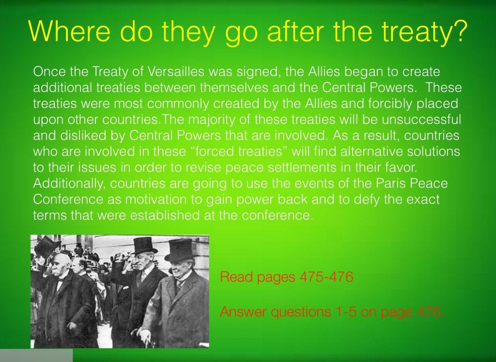Once the Treaty of Versailles was signed, the Allies began to create additional treaties between themselves and the Central Powers. These treaties were most commonly created by the Allies and forcibly placed upon other countries.The majority of these treaties will be unsuccessful and disliked by Central Powers that are involved. As a result, countries who are involved in these “forced treaties” will find alternative solutions to their issues in order to revise peace settlements in their favor. Additionally, countries are going to use the events of the Paris Peace Conference as motivation to gain power back and to defy the exact terms that were established at the conference.