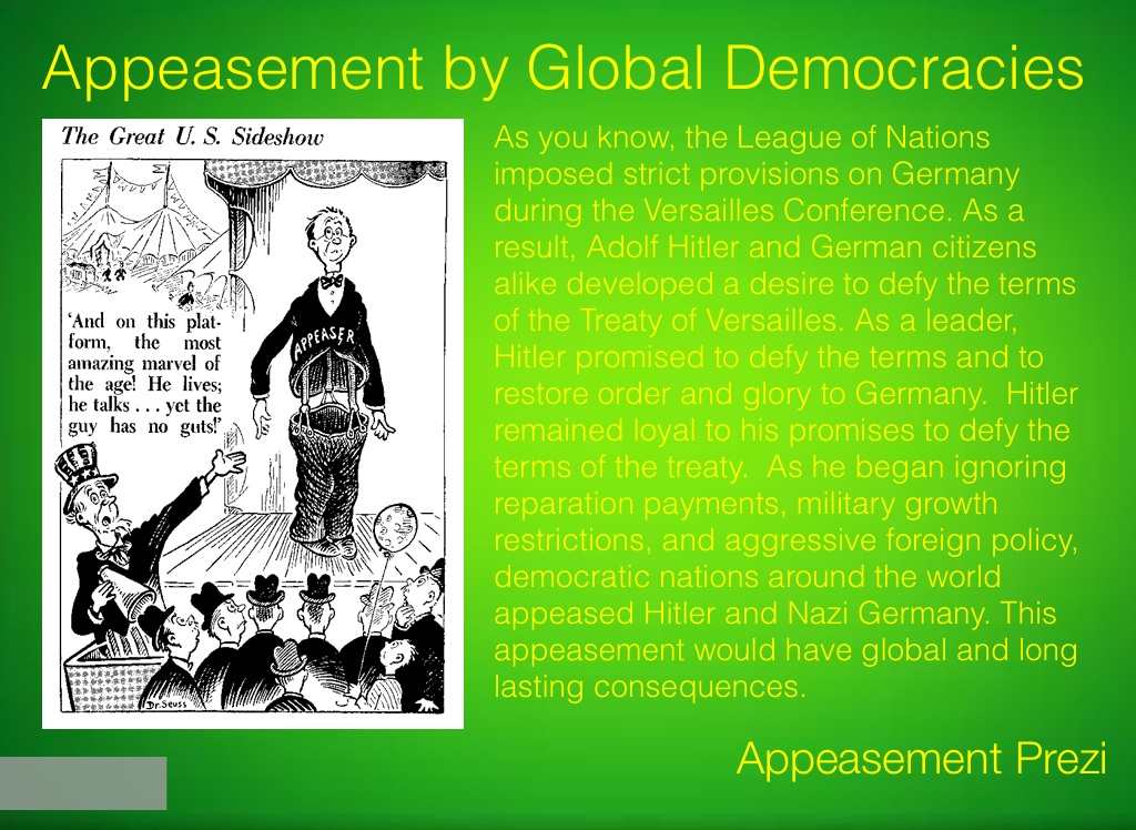 As you know, the League of Nations imposed strict provisions on Germany during the Versailles Conference. As a result, Adolf Hitler and German citizens alike developed a desire to defy the terms of the Treaty of Versailles. As a leader, Hitler promised to defy the terms and to restore order and glory to Germany. Hitler remained loyal to his promises to defy the terms of the treaty. As he began ignoring reparation payments, military growth restrictions, and aggressive foreign policy, democratic nations around the world appeased Hitler and Nazi Germany. This appeasement would have global and long lasting consequences. Â