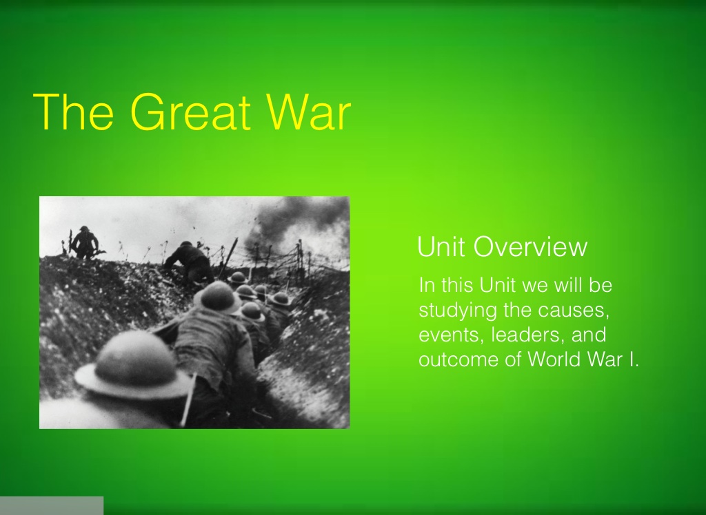 In this Unit we will be studying the causes, events, leaders, and outcome of World War I.