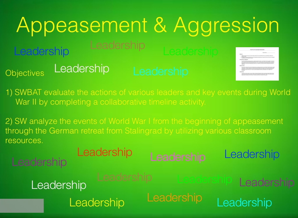 1) SWBAT evaluate the actions of various leaders and key events during World War II by completing a collaborative timeline activity.Â