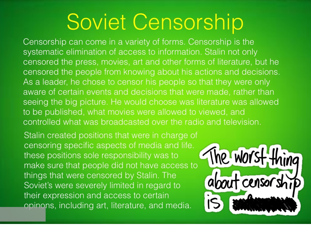 Censorship can come in a variety of forms. Censorship is the systematic elimination of access to information. Stalin not only censored the press, movies, art and other forms of literature, but he censored the people from knowing about his actions and decisions. As a leader, he chose to censor his people so that they were only aware of certain events and decisions that were made, rather than seeing the big picture. He would choose was literature was allowed to be published, what movies were allowed to viewed, and controlled what was broadcasted over the radio and television.