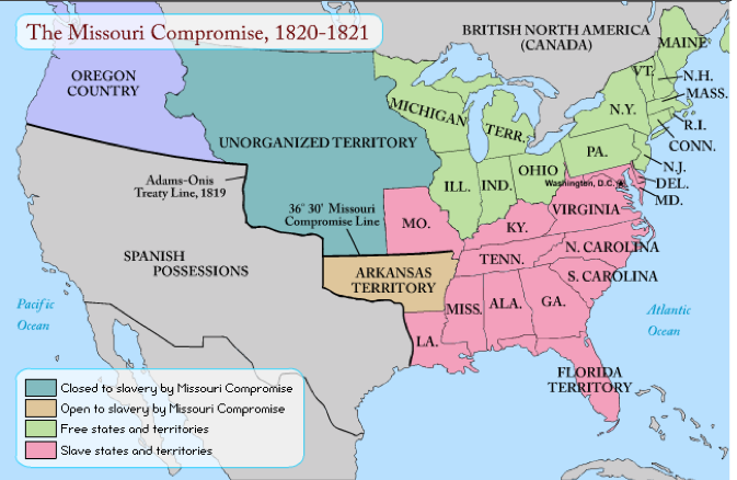 The results of the Missouri Compromise were that Maine was a free state and Missouri was a slave state. They also decided on a line marking the separation between the slave states and the free states at 36 degrees and 30 minutes.